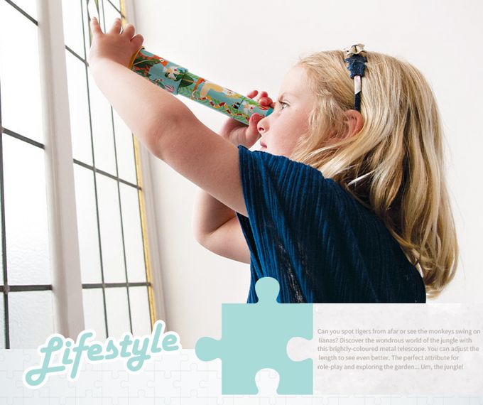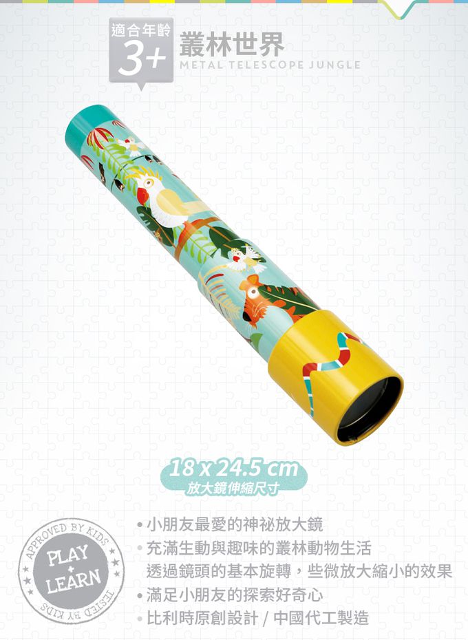 。小朋友最愛的神祕放大鏡。一探充滿生動與趣味的叢林動物生活。透過鏡頭的基本旋轉,些微放大縮小的效果,滿足小朋友的探索好奇心。適合年齡:3歲。伸縮尺寸:約 18 cm x 24.5 cm。比利時原創設計 / 中國代工製造