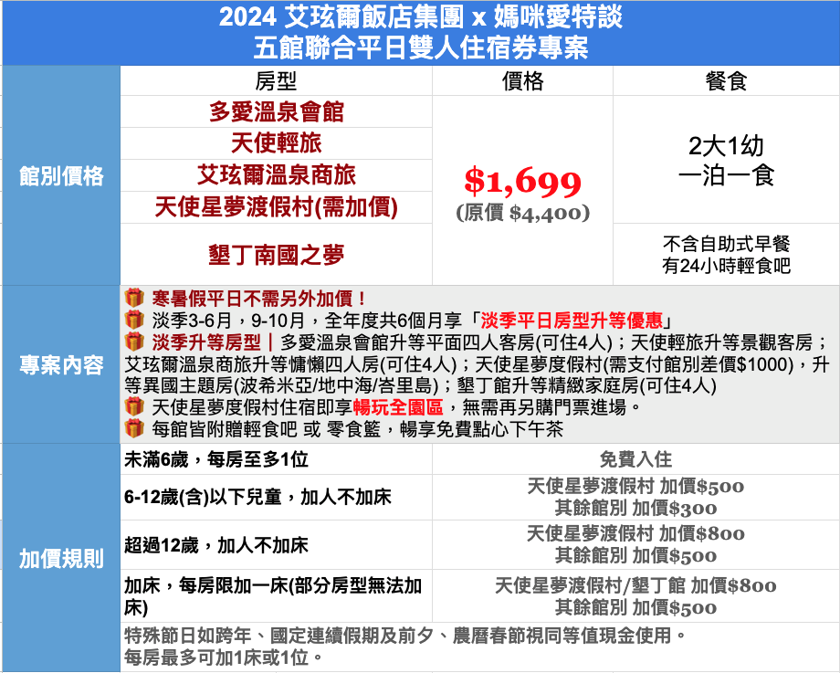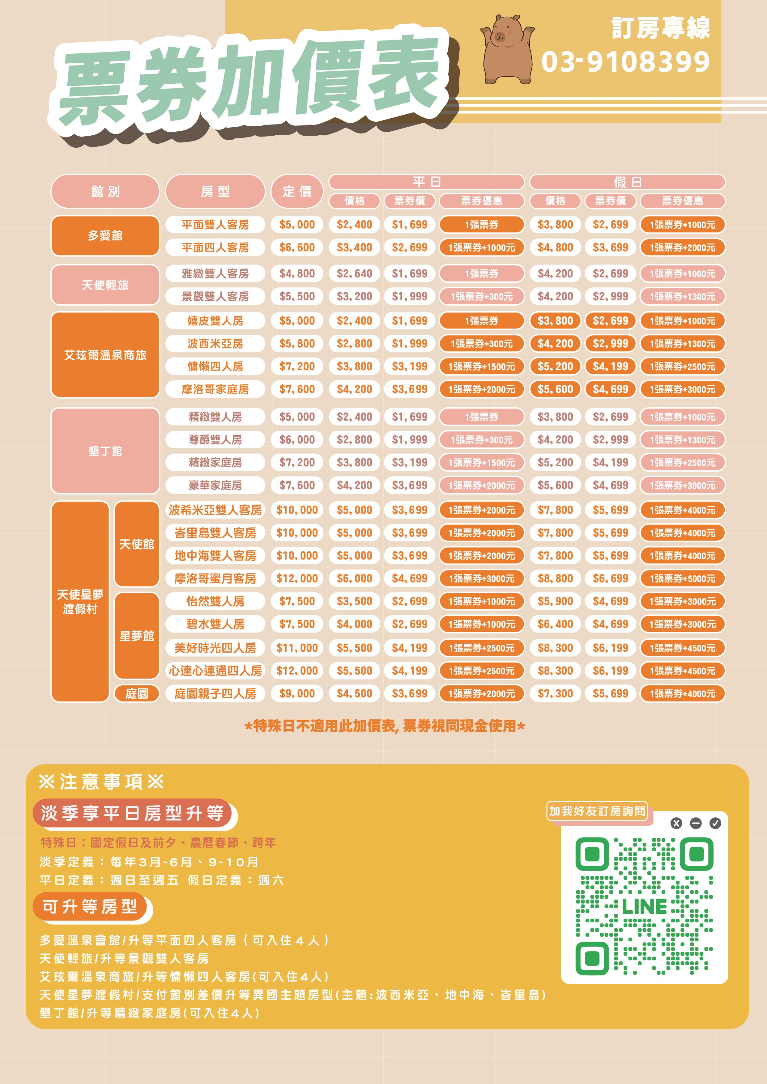 註:加價規則:未滿6歲為幼兒不占床不收費,每房限一位。6-12歲(含)以下為兒童,加人不加床:天使星夢渡假村 加價 +500/人、其餘分館 加價 +300/人;超過12歲加人不加床:天使星夢渡假村 加價 +800/人、其餘分館 加價 +500/人。