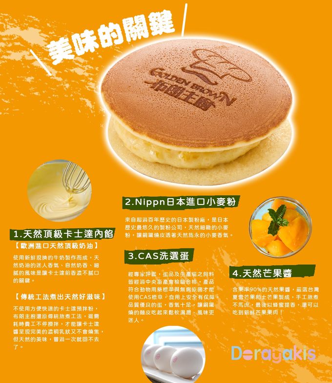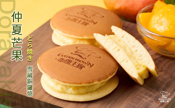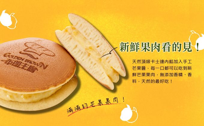 鬆軟香甜的銅鑼燒皮,濕潤的麵皮帶著新鮮雞蛋及蜂蜜的香氣,搭配冰淇淋口感的卡士達內餡,天然頂級奶油的濃濃奶香,配上含果率高達90%的手工熬煮天然芒果醬,每一口都是滿滿芒果香氣,還可以吃到芒果果肉,就像在吃芒果冰淇淋一樣,夏季小甜點必定非他莫屬!