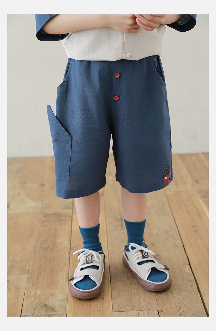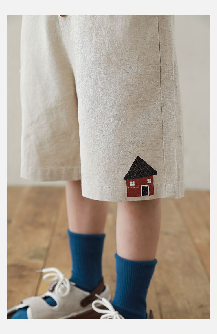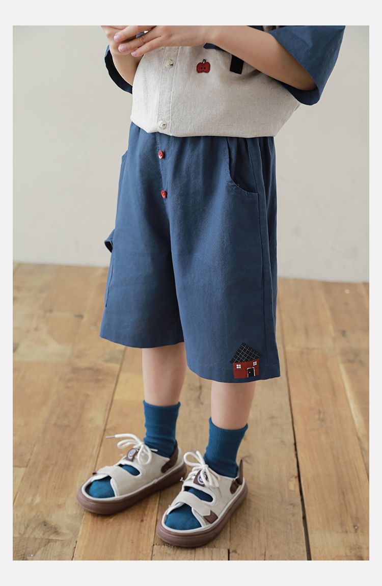 棉麻感休閒短褲-森林小屋-藏青色
