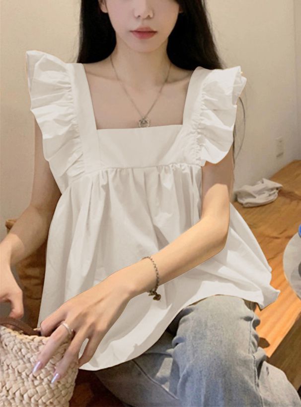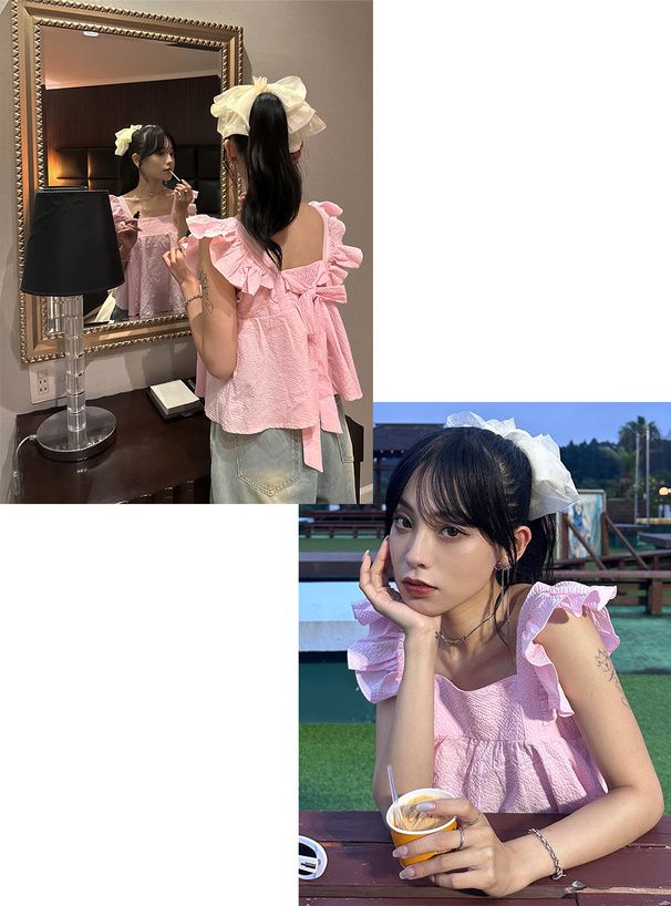 • 品名:甜美荷葉背後綁帶傘狀背心