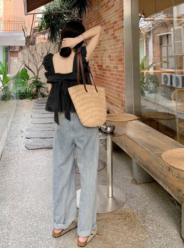 日本 GRL - 甜美荷葉背後綁帶傘狀背心-經典黑 (M)