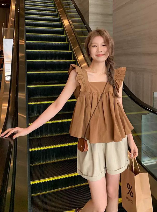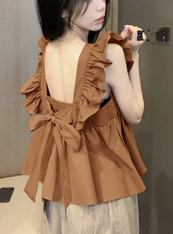 日本 GRL - 甜美荷葉背後綁帶傘狀背心-焦糖棕 (M)