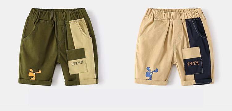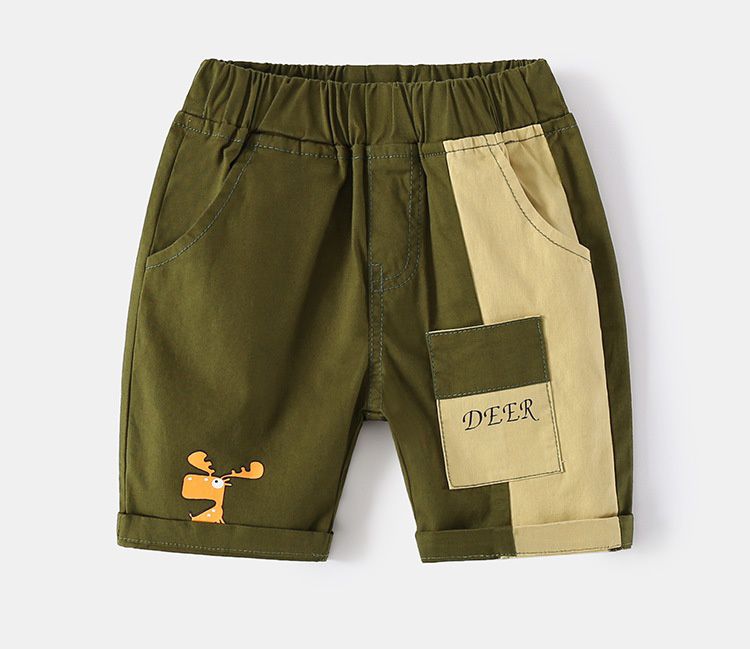腰鬆緊休閒五分褲-可愛小鹿-拼色軍綠