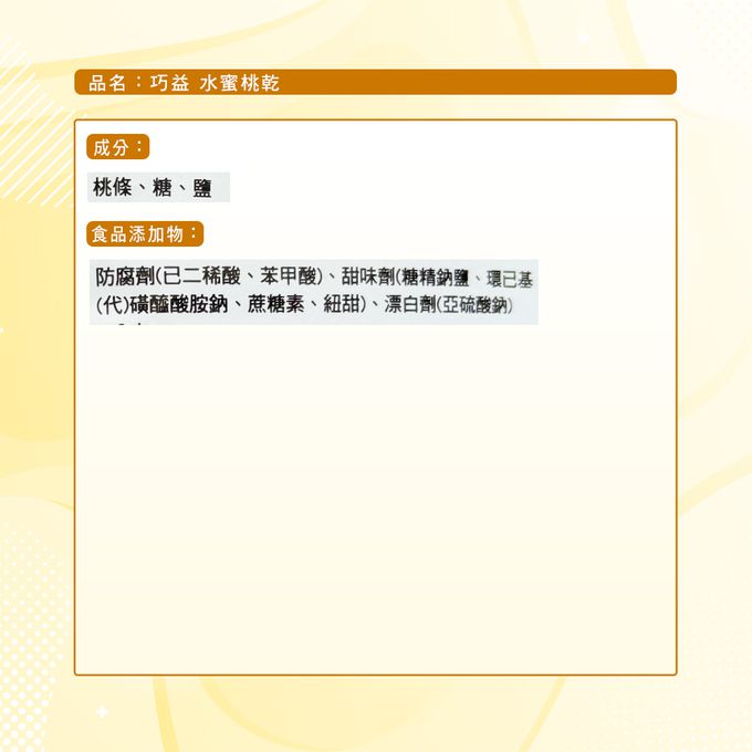 成分:桃條、糖、鹽、防腐劑(已二烯酸、苯甲酸)、甜味劑(糖精鈉鹽、環已基(代)磺醯胺酸鈉、蔗糖素、紐甜)、漂白劑(亞硫酸鈉)