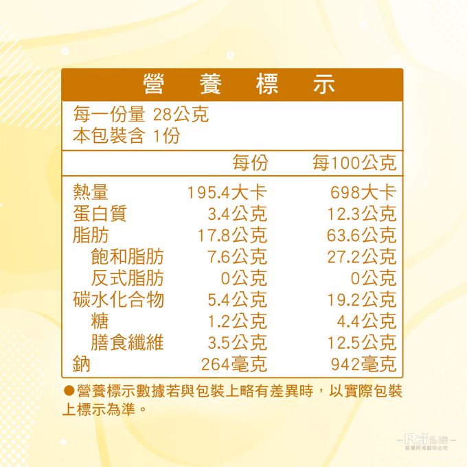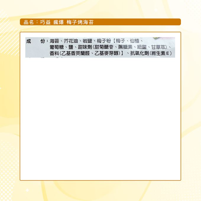 過敏原:酥脆:本產品包含大豆及其製品 椒鹽:本產品生產製程廠房,其設備或生產線有處理甲殼類、芒果、堅果類、芝麻、含麩質之穀物及其製品、豆類、魚類、頭足類、螺貝類 梅子:本產品生產製程廠房及設備或生產管線有處理麻油及其製品