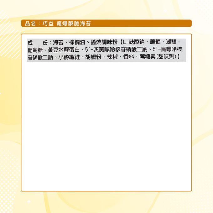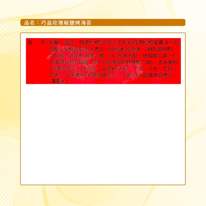 成分:酥脆:海苔、棕櫚油、醬燒調味粉【L-麩酸鈉、蔗糖、湖鹽、葡萄糖、黃豆水解蛋白、5'-次黃嘌呤核苷磷酸二鈉、5'-鳥嘌呤核苷磷酸二鈉、小麥纖維、胡椒粉、辣椒、香料、蔗糖素(甜味劑)】 椒鹽:砂糖、海苔、特選棕櫚油[單元不飽和特選棕櫚果實油、脂肪酸山梨醇酐酯(乳化劑)]、胡椒鹽[玫瑰鹽、味精(調味劑)、白胡椒、調味劑(胺基乙酸、DL-胺基丙酸、琥珀酸二鈉、5'-次黃嘌呤核苷磷酸二鈉、5'-鳥嘌呤核苷磷酸二鈉)、玉米澱粉(非基因改造)、黑胡椒、百草粉(香料、丁香、八角、花椒、肉桂、玉米澱粉(非基因改造)]、二氧化矽(品質改良劑)、蓬萊米 梅子:海苔、芥花油、岩鹽、梅子粉【梅子、仙楂、葡萄糖、鹽、甜味劑(甜菊醣苷、蔗糖素、紐甜、甘草萃)、香料、(乙基香莢蘭醛、乙基麥芽醇)】、抗氧化劑(維生素E)