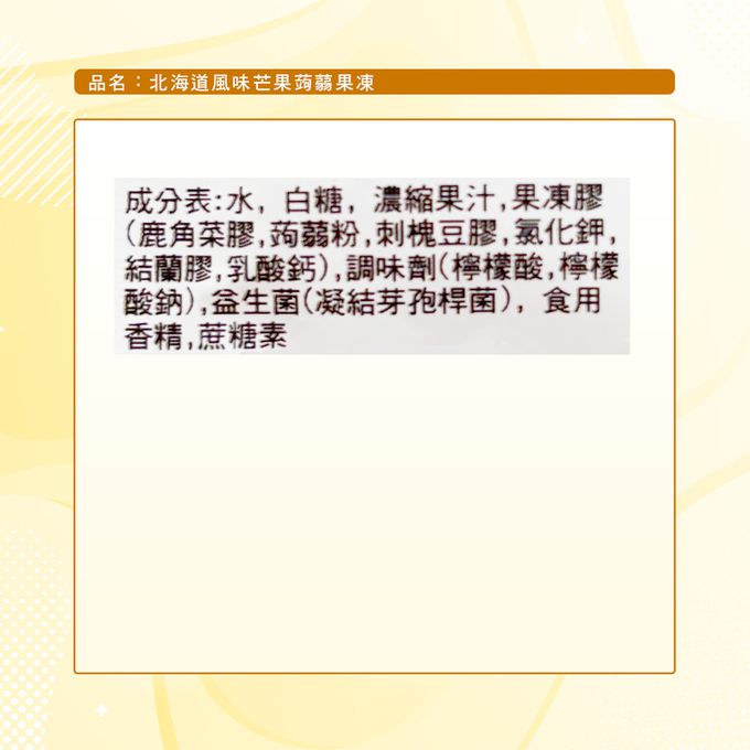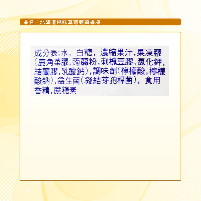 成分:草莓:水、白糖、濃縮果汁、果凍膠(鹿角菜膠、蒟蒻粉、刺槐豆膠、氯化鉀、結蘭膠、乳酸鈣)、調味劑(檸檬酸、檸檬酸鈉)、益生菌(凝結芽孢桿菌)、食用香精、蔗糖素 芒果:水、白糖、濃縮果汁、果凍膠(鹿角菜膠、蒟蒻粉、刺槐豆膠、氯化鉀、結蘭膠、乳酸鈣)、調味劑(檸檬酸、檸檬酸鈉)、益生菌(凝結芽孢桿菌)、食用香精、蔗糖素