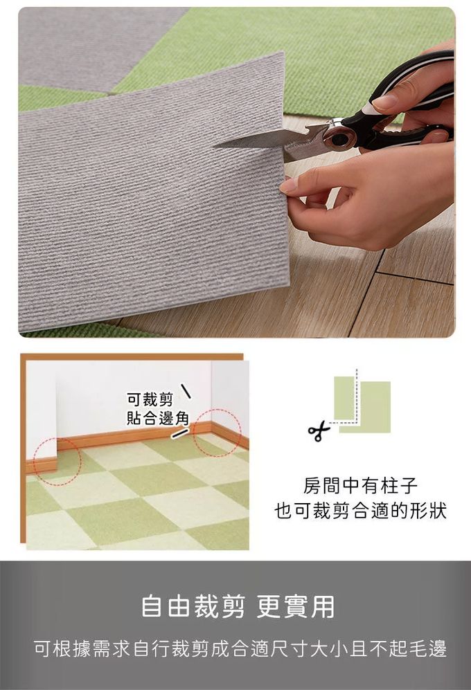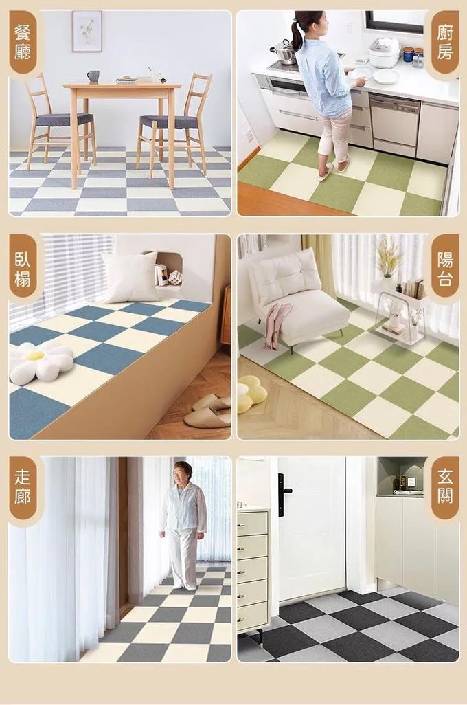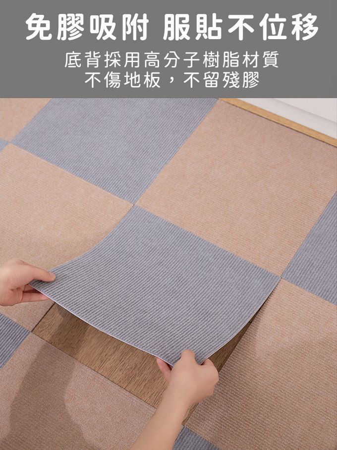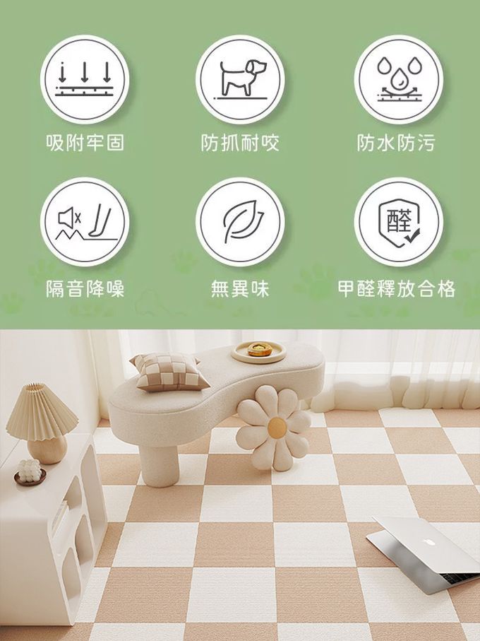 6.背面丙烯酸樹脂材質凸起處會形成無數個細小吸盤吸附於地面,如有打蠟(尤其是固體蠟),潮溼、水氣等會影響吸附能力,儘量在乾淨、保持乾燥的環境使用,如打蠟請在鋪設後檢查吸附效果。