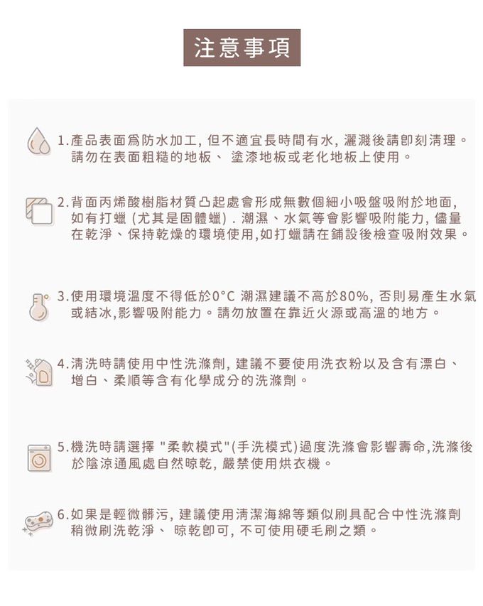 2.機洗洗滌時,請放入洗衣網。機洗洗滌可能會導致皺紋、變形和縮水,請設置為柔和模式(手洗模式)。過度洗滌會影響地墊使用壽命。洗滌後請於陰涼通風處自然晾乾,切勿使用烘乾機。