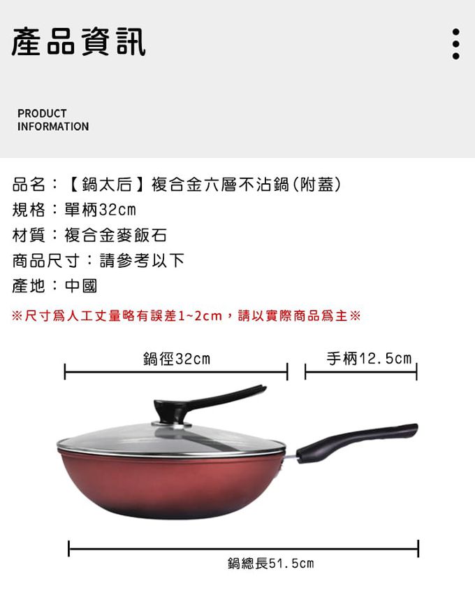 商品名稱:【鍋太后】複合金六層不沾鍋/炒鍋/單柄帶蓋炒鍋-32cm