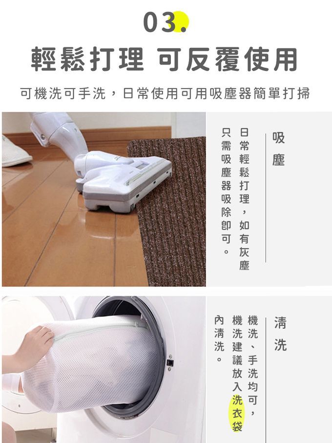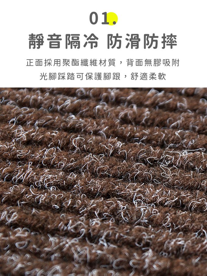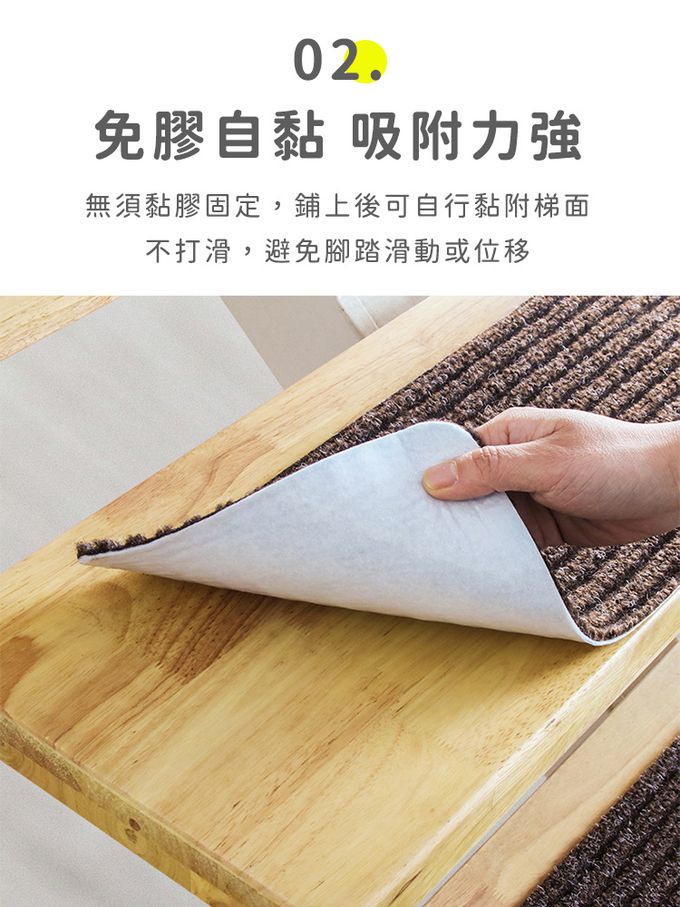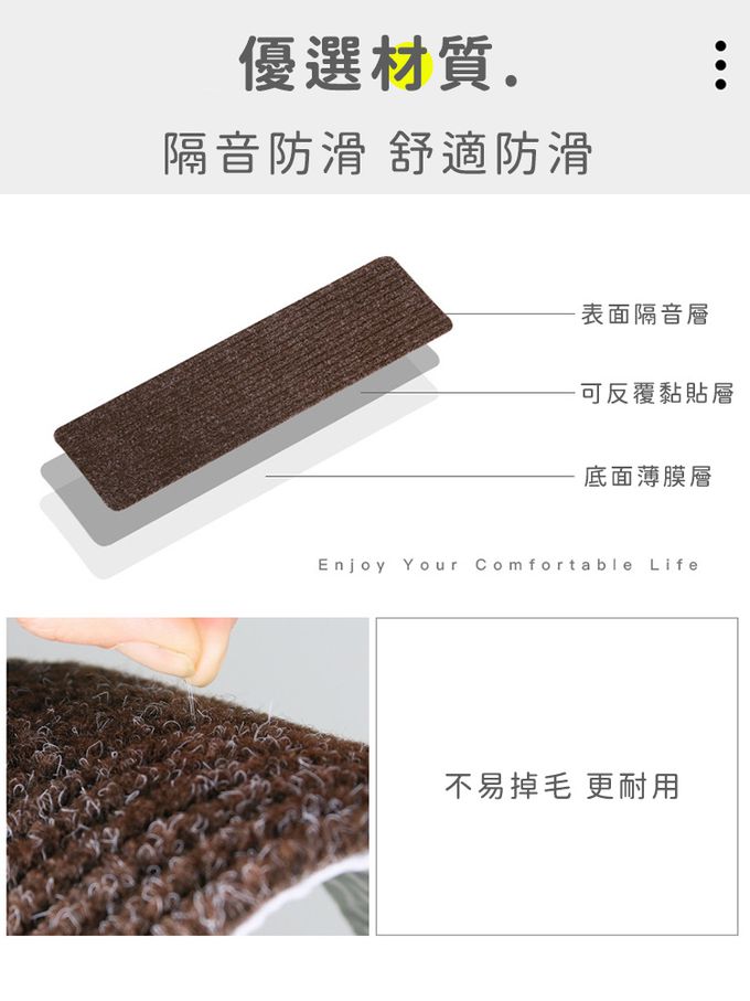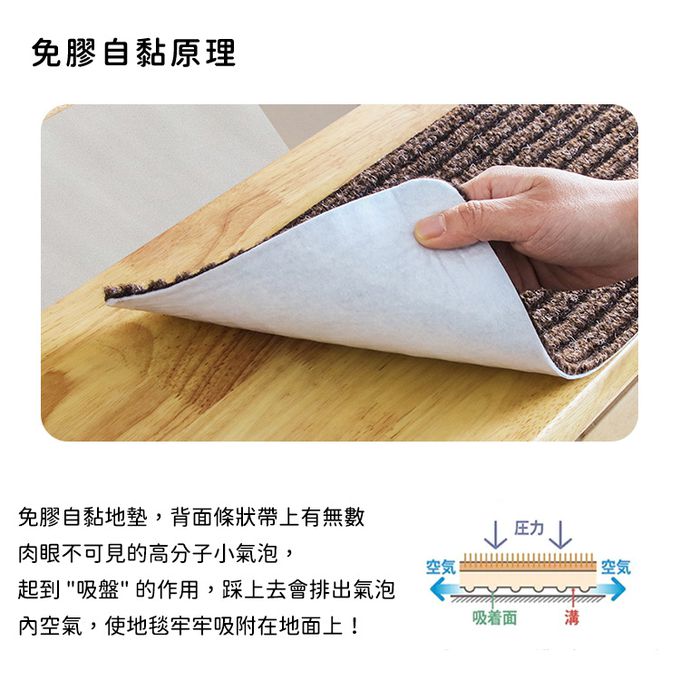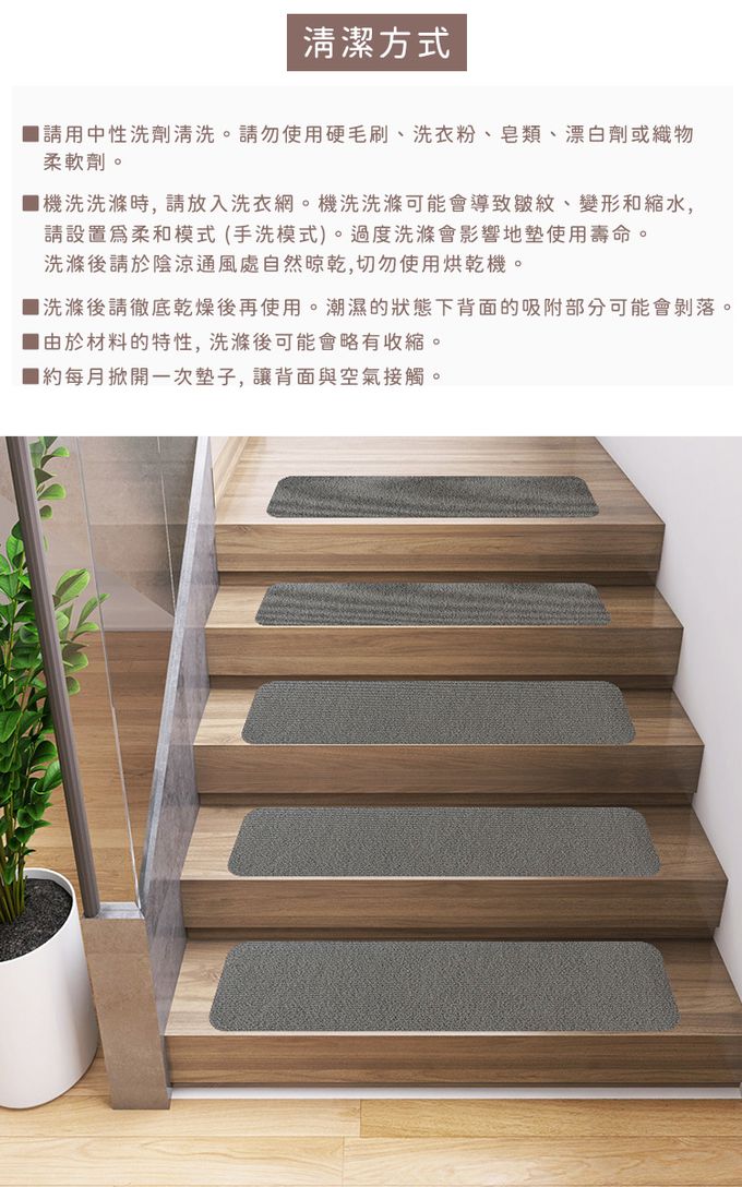 • 注意事項:1.商品到貨享鑑賞期之權益,鑑賞期並非試用期,辦理退貨商品必須是全新狀態且紙箱及商品配件包裝須完整。商品一經使用或組裝後,恕無法辦理退換貨。 2.商品為人工丈量略有1~3公分內誤差,請以實品為主。 3.網頁商品會因面板螢幕解析度不同,造成圖片顏色呈現略有不同,請以實品顏色為準。 4.產品表面為防水加工,但不適宜長時間有水,灑濺後請即刻清理。 5.請勿在表面粗糙的地板、塗漆地板或老化地板上使用。 6.背面丙烯酸樹脂材質凸起處會形成無數個細小吸盤吸附於地面,如有打蠟(尤其是固體蠟),潮溼、水氣等會影響吸附能力,儘量在乾淨、保持乾燥的環境使用,如打蠟請在鋪設後檢查吸附效果。 7.淸洗時請使用中性洗滌劑,建議不要使用洗衣粉以及含有漂白、增白、柔順等含有化學成分的洗滌劑 8.使用環境溫度不得低於0°C 潮濕建議不高於80%, 否則易產生水氣或結冰,影響吸附能力。請勿放置在靠近火源或高溫的地方。 9.機洗時請選擇"柔軟模式"(手洗模式)過度洗滌會影響壽命,洗滌後於陰涼通風處自然晾乾,嚴禁使用烘衣機。 10.如果是輕微髒污,建議使用清潔海綿等類似刷具配合中性洗滌劑稍微刷洗乾淨、晾乾即可,不可使用硬毛刷之類。 11.樓梯不是光滑材質的,且表面凹凸不平的使用無防滑效果。 12.使用前先淸潔梯面,表面有水、油等汙漬,會影響吸附。 13.換洗時請勿用力快速揭起,慢慢揭開,以免損壞底板或膠層。 14.本品可機洗、手洗,洗後膠層不要曝曬。