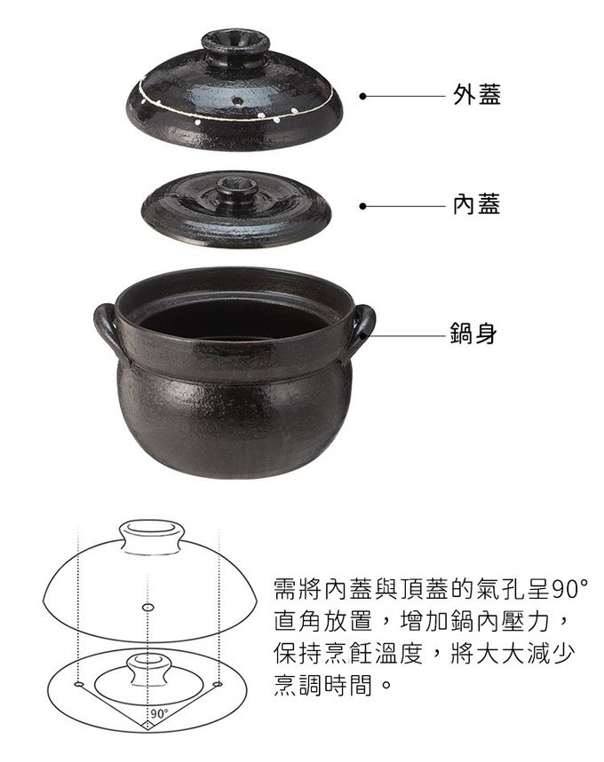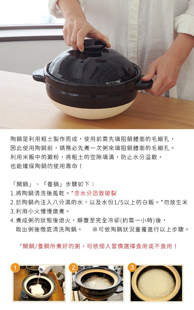 陶鍋是利用粗士製作而成,使用前需先填阻鍋體面的毛細孔,此使用陶鍋前,請務必先煮一次粥來塤阻鍋體面的毛細孔,利用米飯中的澱粉,將粗士的空隙填滿,防止水分溢散,也能確保陶鍋的使用壽命!