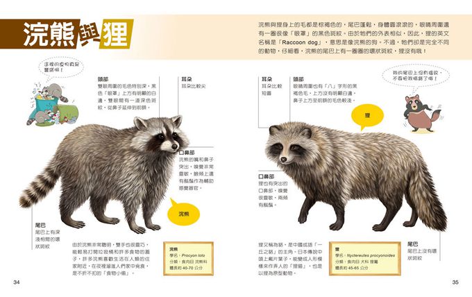 家鵝和家鴨都有著白胖的身體和長脖子,當一群鴨和鵝在湖水上優游的時候,你能夠辨別誰是鴨、誰是鵝嗎?浣熊與狸身上的毛都是棕褐色的,尾巴蓬鬆,身體圓滾滾的,眼睛周圍還有一圈很像「眼罩」的黑色斑紋,你知道要如何分辨浣熊與狸嗎?