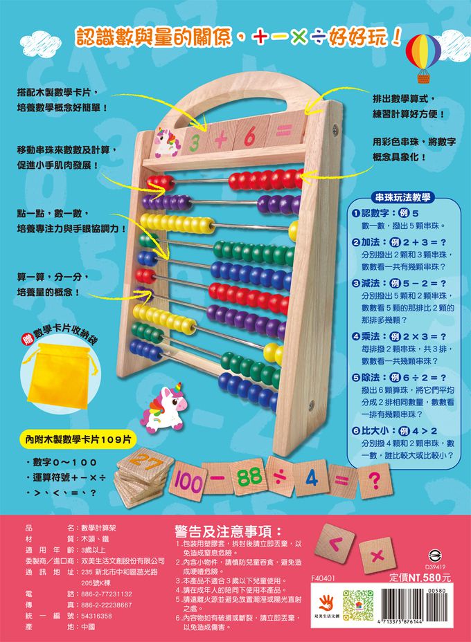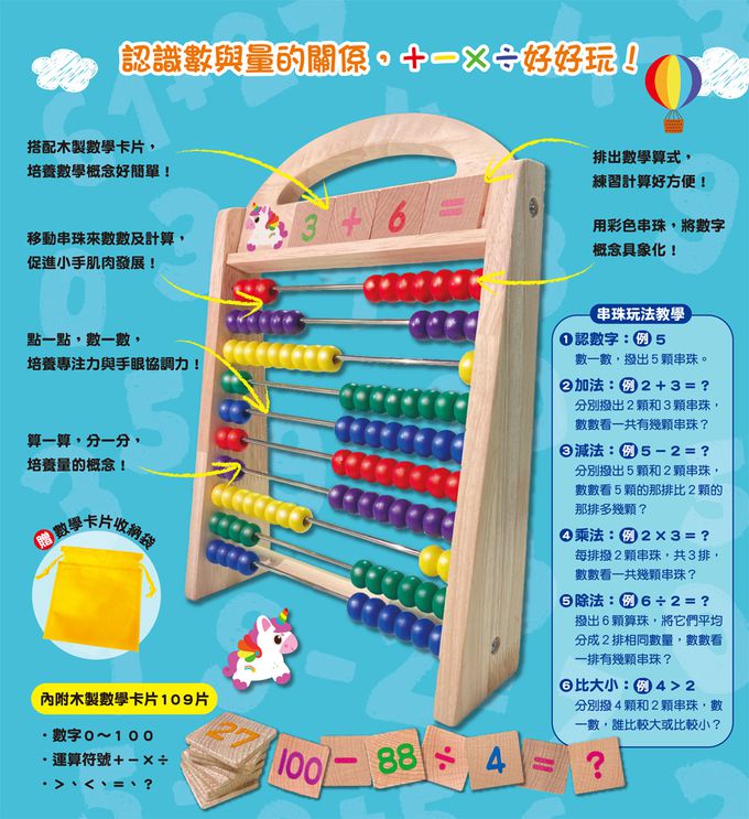 小獨角獸手提數學計算架(內含109片木製數學卡片+1個卡片收納袋)