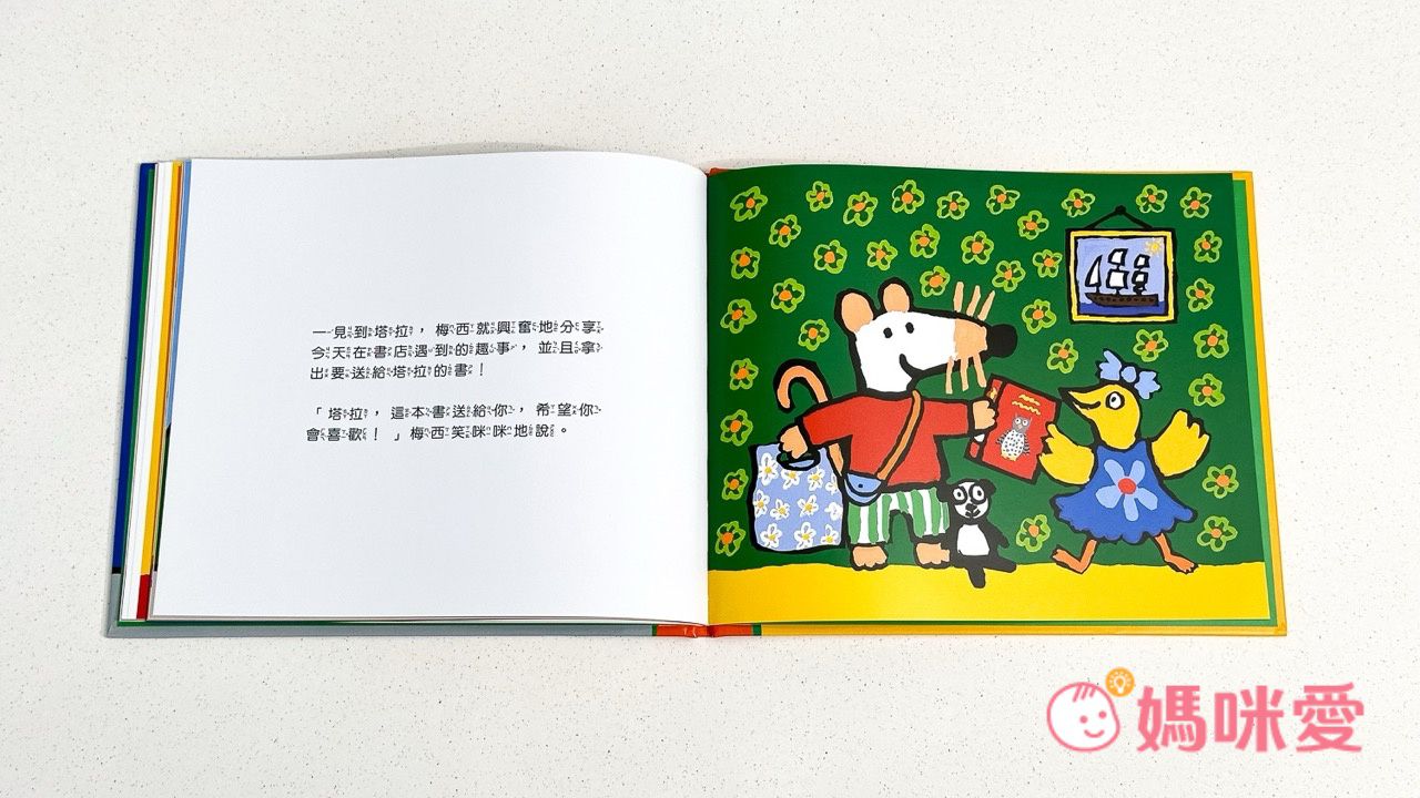 故事情境中,小鼠梅西和她的朋友們在書店中發現各種書籍⋯⋯。這樣的情節設計很能夠吸引超愛到書店看書的扉扉,故事內容不僅貼近孩子的日常生活,例如選擇喜歡的書、和朋友一起閱讀等,扉扉在閱讀時都能產生共鳴,從而更加投入。