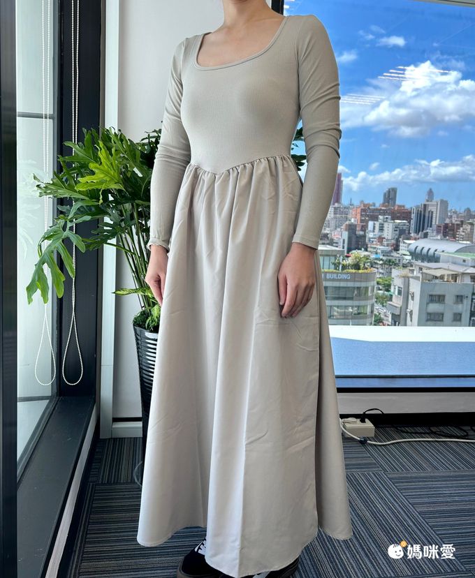 840796 法式優雅方領拼接顯瘦長洋裝-氣質卡其灰(F)