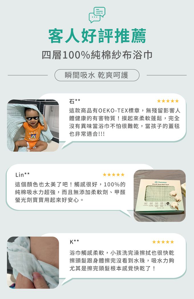 • 品名:四層100%純棉紗布浴巾 (90*160 公分) 1件入 [限購體驗價]