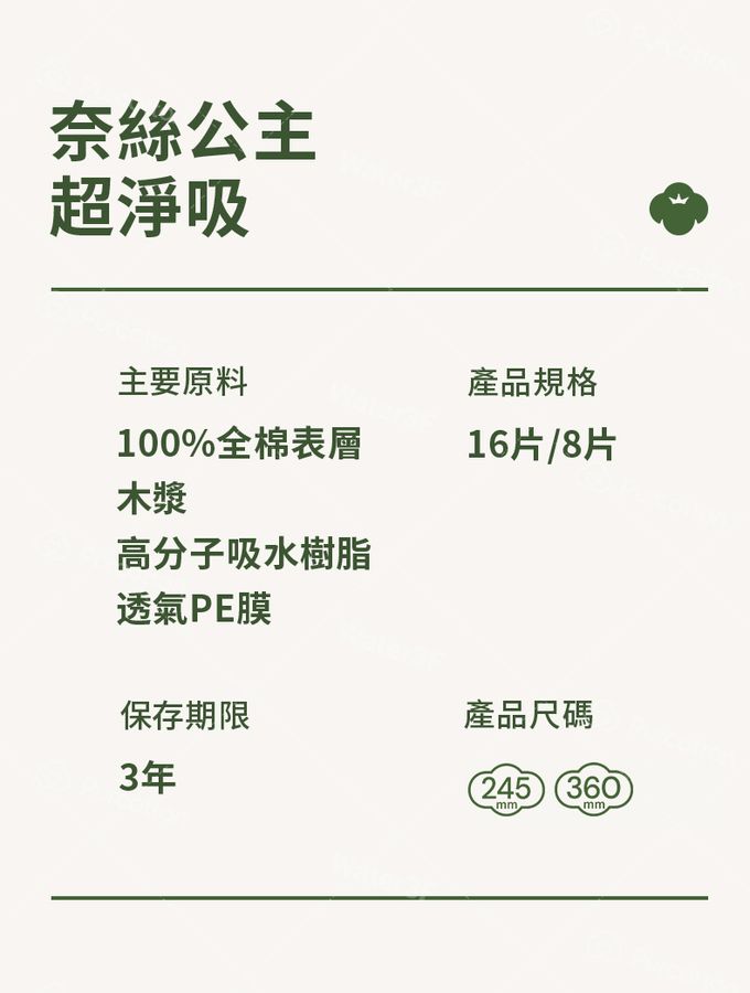 • 品名:奈絲公主 100%純棉超淨吸夜用加長型衛生棉 (36公分X8入X 6包)