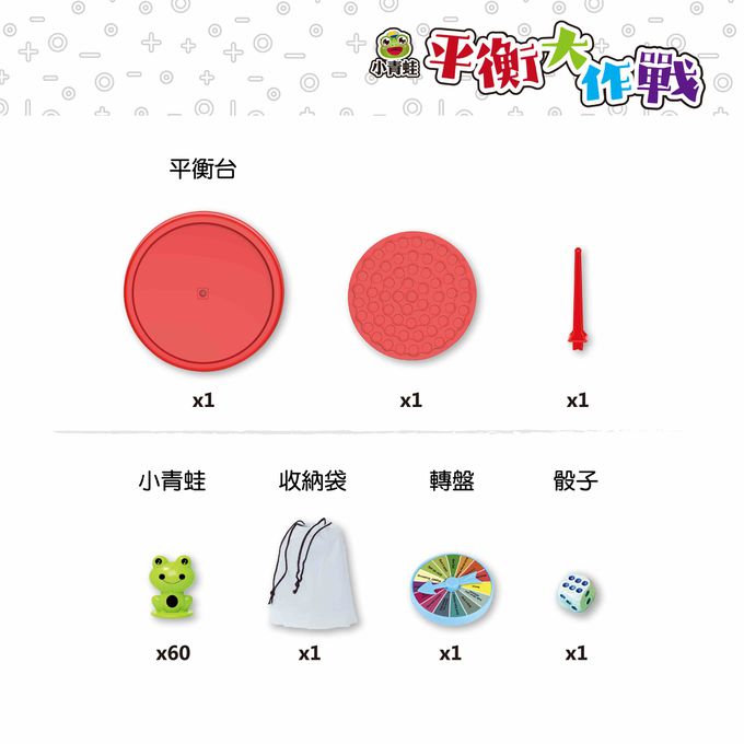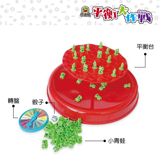 青蛙平衡台是一款玩法簡單容易上手的遊戲,是和朋友或家人相聚時增進感情 的最佳產品.本產品內含一組平衡台,60隻小青蛙,一顆骰子和一個懲罰轉盤.玩家投擲骰子,決定要放幾隻小青蛙到平衡台上,過程中如果讓平台失去平衡導致小青蛙們都掉了 下來的玩家失敗,失敗的玩家轉動轉盤,決定懲罰方法.你還可以在底盤上加進一 些水,讓掉下來的小青蛙就像掉進水裡一般.額外提供一個束口袋,方便收納小青 蛙,骰子和轉盤.