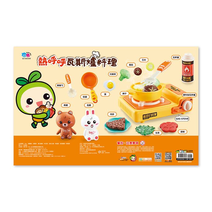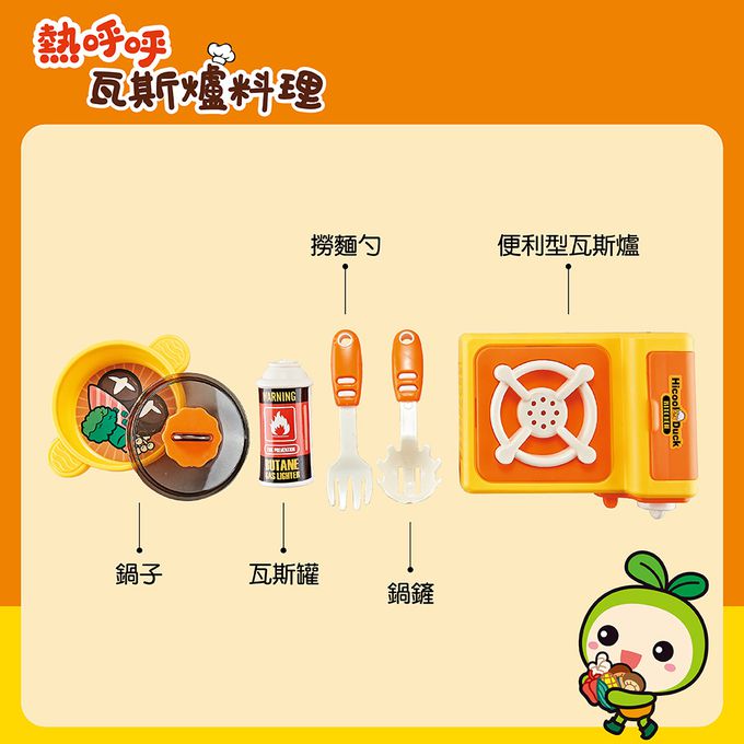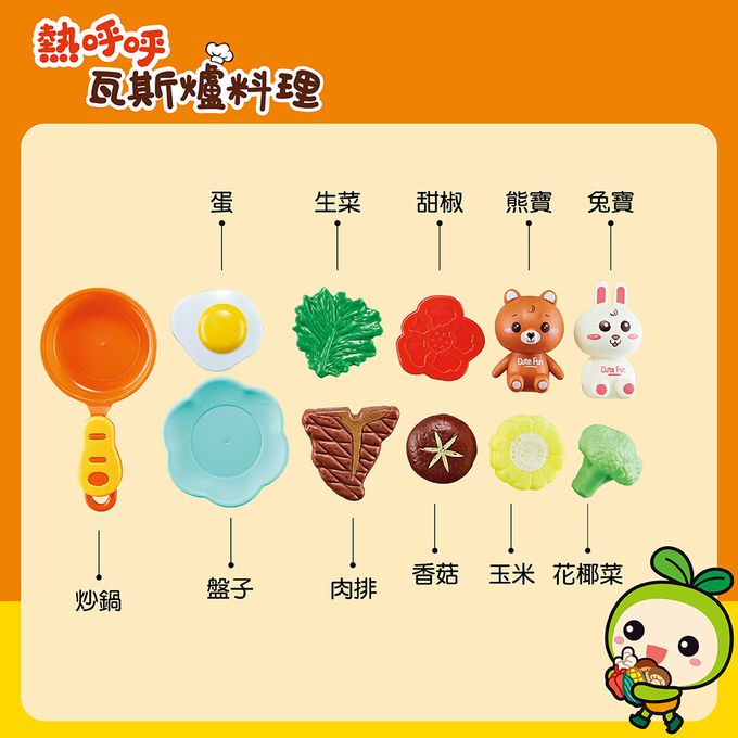 本產品包含一個模擬生活中真實可以裝瓦斯罐的卡式瓦斯爐,小型平底鍋,餐盤及食物模型,以及兩個動物小人偶.可以進行烹飪的模擬動作,享受扮演樂趣.