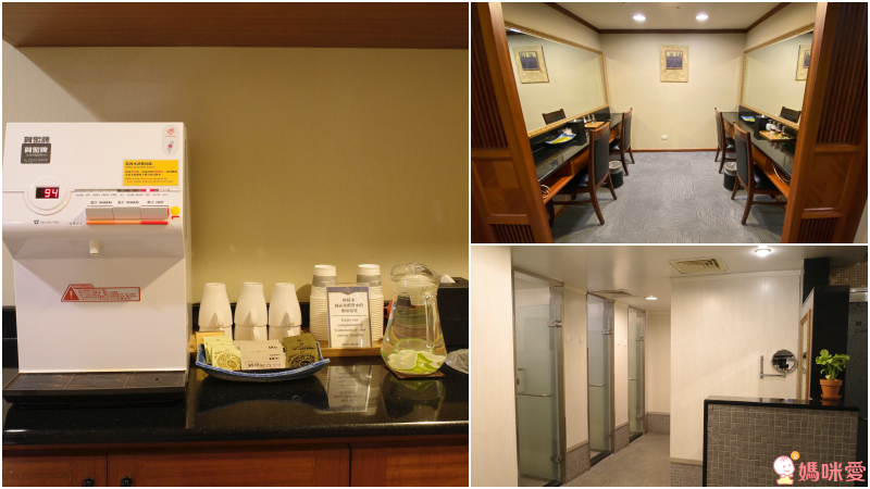 泡到一半突然口渴了也不擔心,旁邊就有提供飲用茶水、檸檬水;置物櫃裡有擺放浴巾、小毛巾,也有淋浴梳洗間可以使用,不用大包小包、濕淋淋地來回房間,很方便