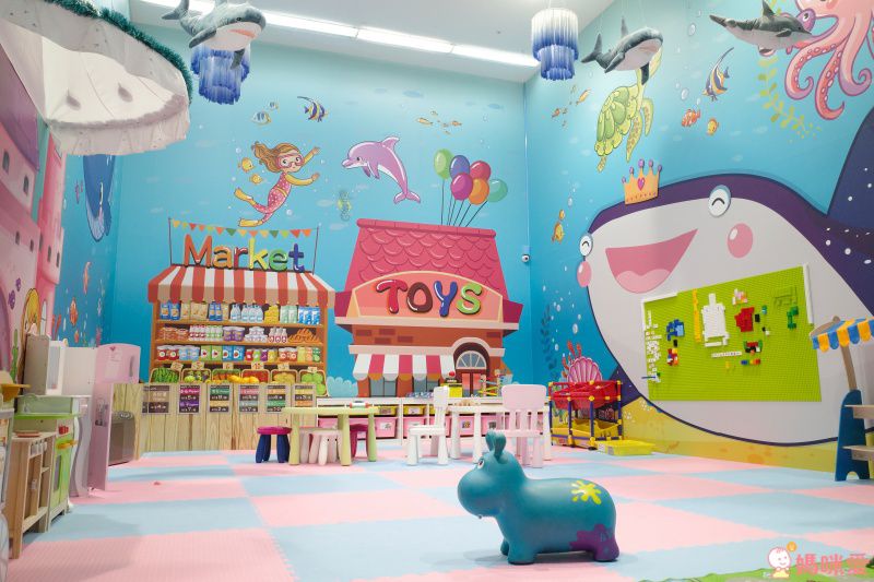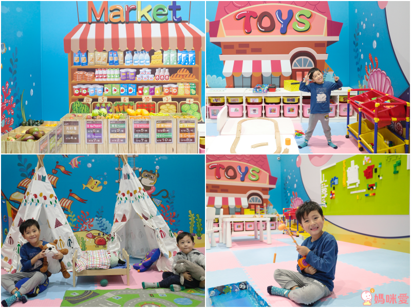 Market 超市區有各式各樣的蔬菜水果可以採購;還有各種不同類型的玩具、鯊魚樂高牆;兩兄弟在孩子們最愛的帳篷區也玩了好久