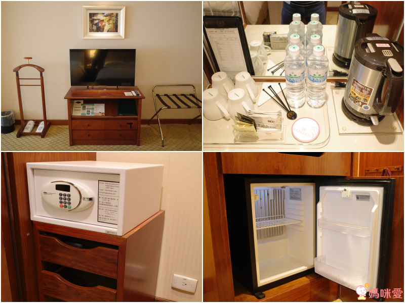電視旁有西裝架、免洗室內拖;免費的礦泉水與茶包、UCC 咖啡包,以及電熱水壺、冰箱;還有保險箱,應有盡有