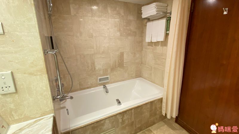 寬廣的衛浴,浴缸左右側都有手把、整個浴缸底層也有設計止滑,不怕小孩泡到一半會滑倒;蓮蓬頭是調節式的,可上下挪動,使用上蠻方便