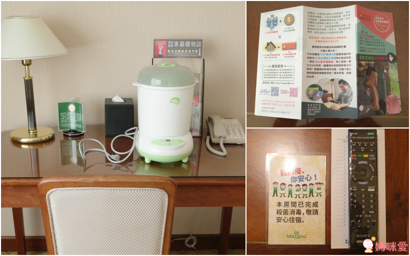 房間裡的電腦桌上有奶瓶消毒鍋(可提前請酒店預留)以及慢飛家族的圓夢計畫,愛心捐款細節都在雜誌架上的 DM 裡。卡片上溫馨提醒房間已消毒完全,還有包著防護膜的電視遙控器,這些小細節的注重都讓爸媽很放心與孩子共同使用