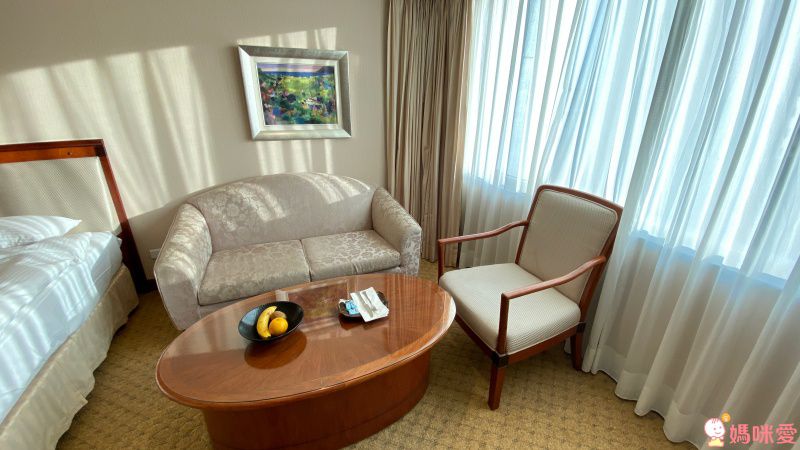 窗邊是舒適的雙人沙發、單人椅,白天光線灑落下來很美呢!桌上有長榮貼心準備的迎賓水果