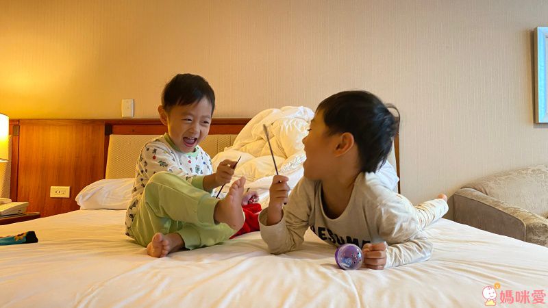 早晨時光,兩個人體自備鬧鐘,時間一到就跳起來啦!看兄弟倆那麼開心,就知道睡得有多飽、多舒服享受~