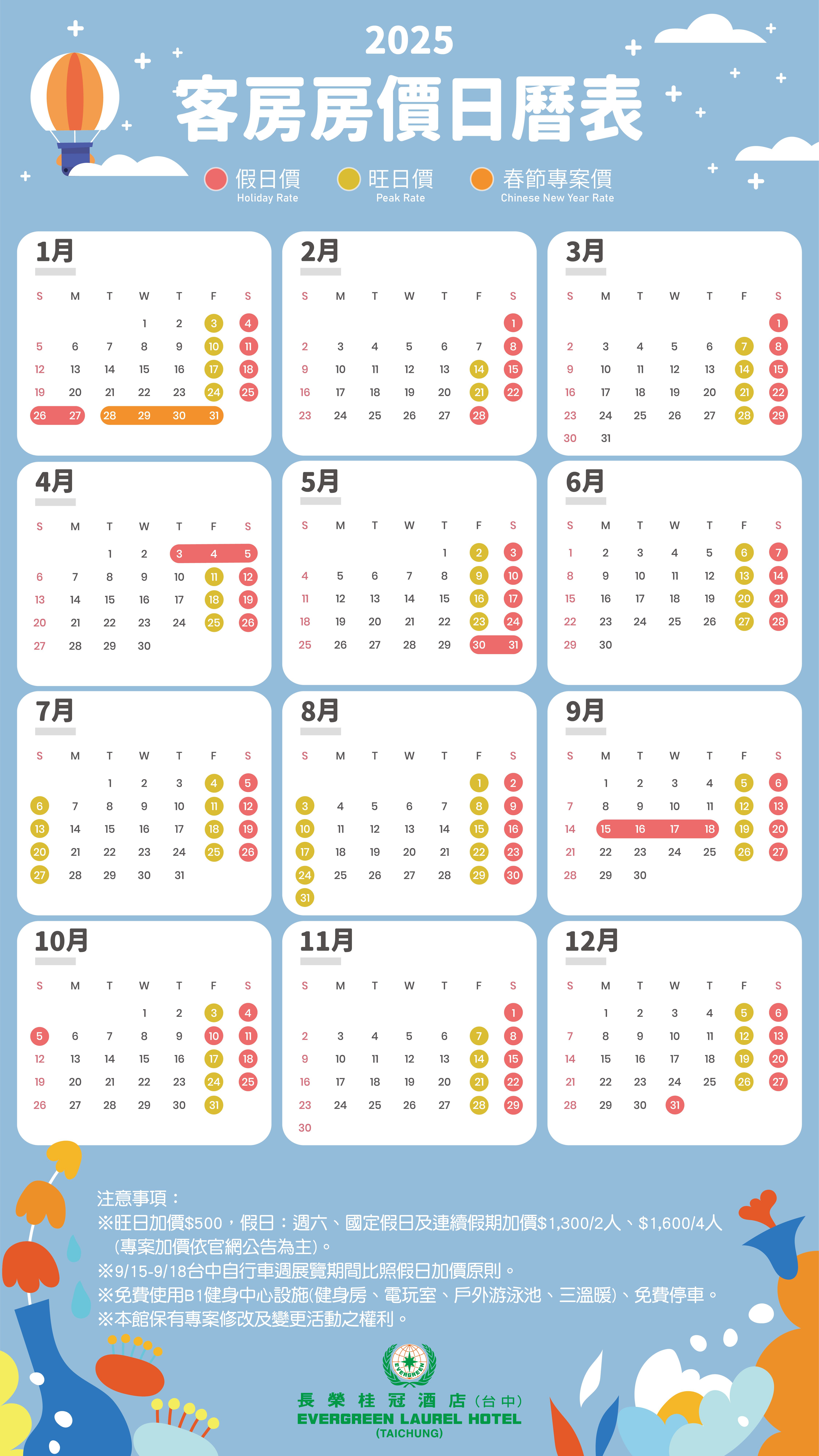 註 2:平日:一般星期日~星期四、旺日:一般星期五(其餘旺日規定請參考飯店公告,飯店行事曆)、假日:星期六、國定假日/連假