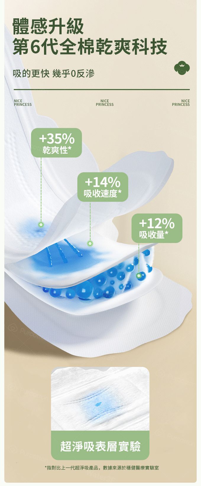 • 第6代全棉乾爽科技,吸收快速不黏膩