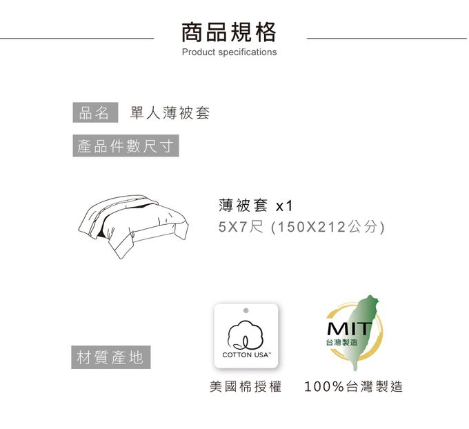 品名:單人薄被套5x7 防蹣抗菌100%美國棉