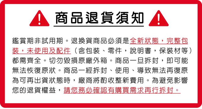 您所購買的商品享有7天的鑑賞期/猶豫期權益,但此期間並非試用期,您所退回的商品必須是未經使用的全新狀態,包含完整包裝、配件、說明文件及贈品等。
