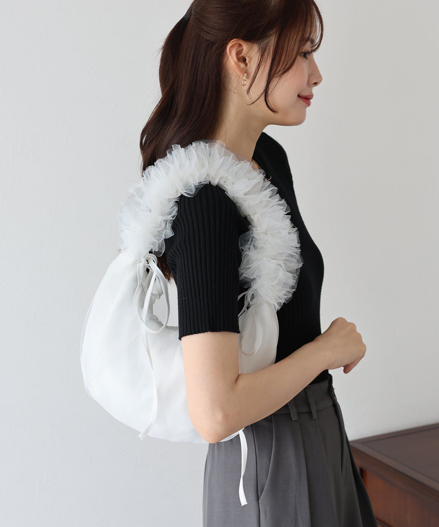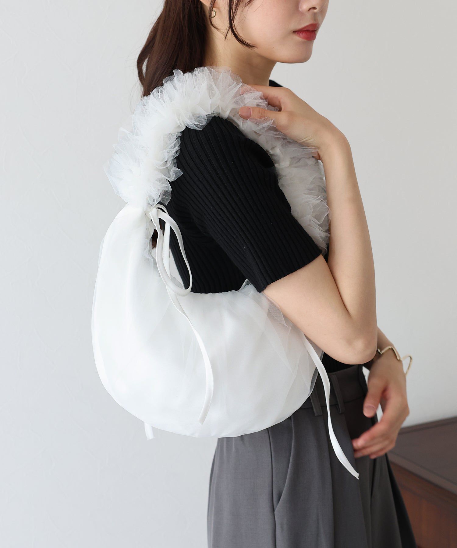日本 BLUE EAST - 浪漫澎澎薄紗肩帶側背包-白