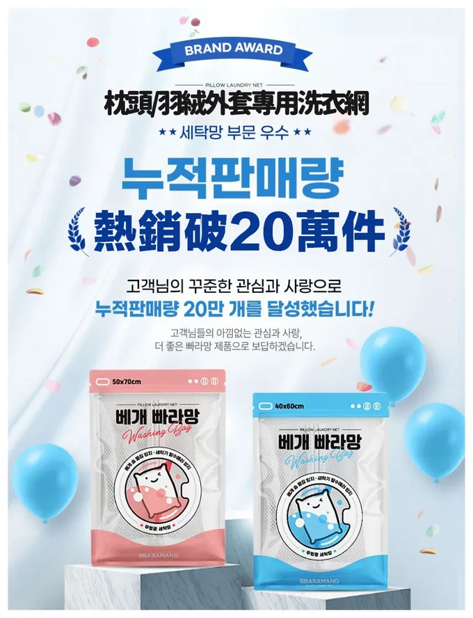 韓國BBARAMANG自從推出「枕頭/羽絨外套專用洗滌網袋」之後,除了產品熱銷、搜尋排行榜竄升第1名!至今也熱銷破20萬件,是韓國相當有名的一個洗滌網袋品牌。