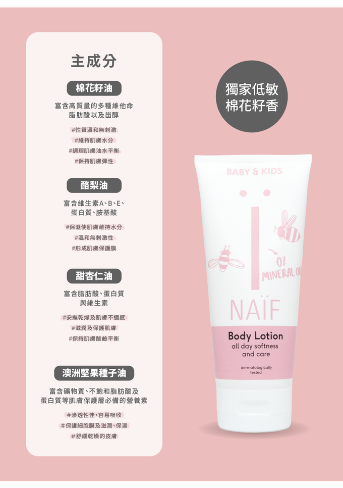 添加澳洲堅果種子油/甜杏仁/酪梨油,使肌膚長期維持滋潤,舒緩極度乾燥的肌膚不適感