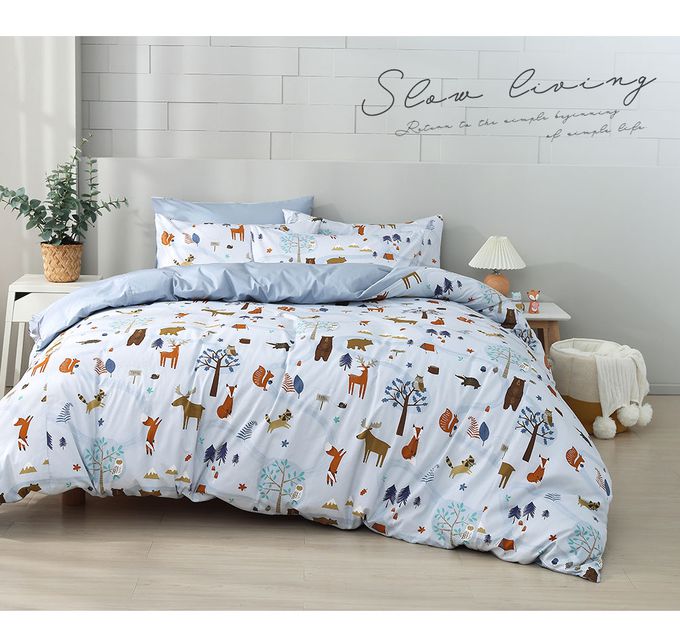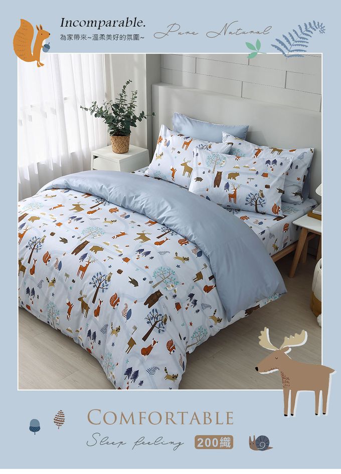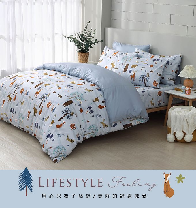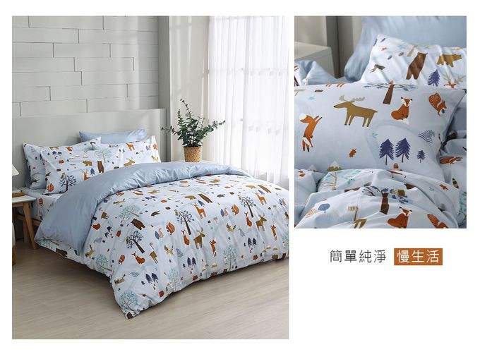 雙人床包枕套組 100%美國棉 精梳棉-呼嚕森林-藍