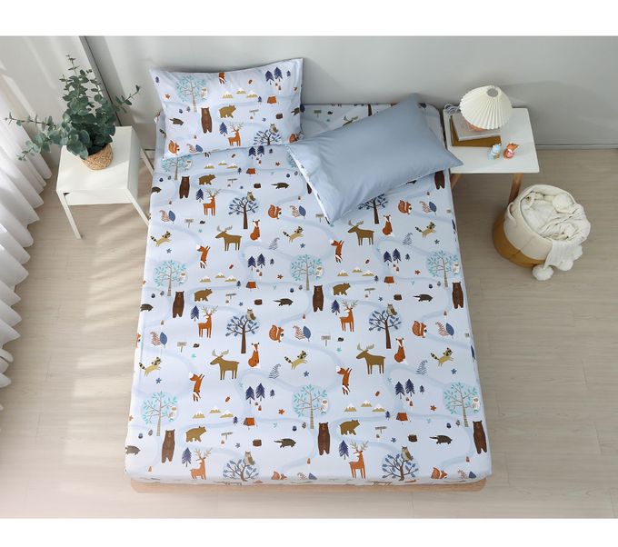 雙人特大床包枕套組 100%美國棉 精梳棉-呼嚕森林-藍