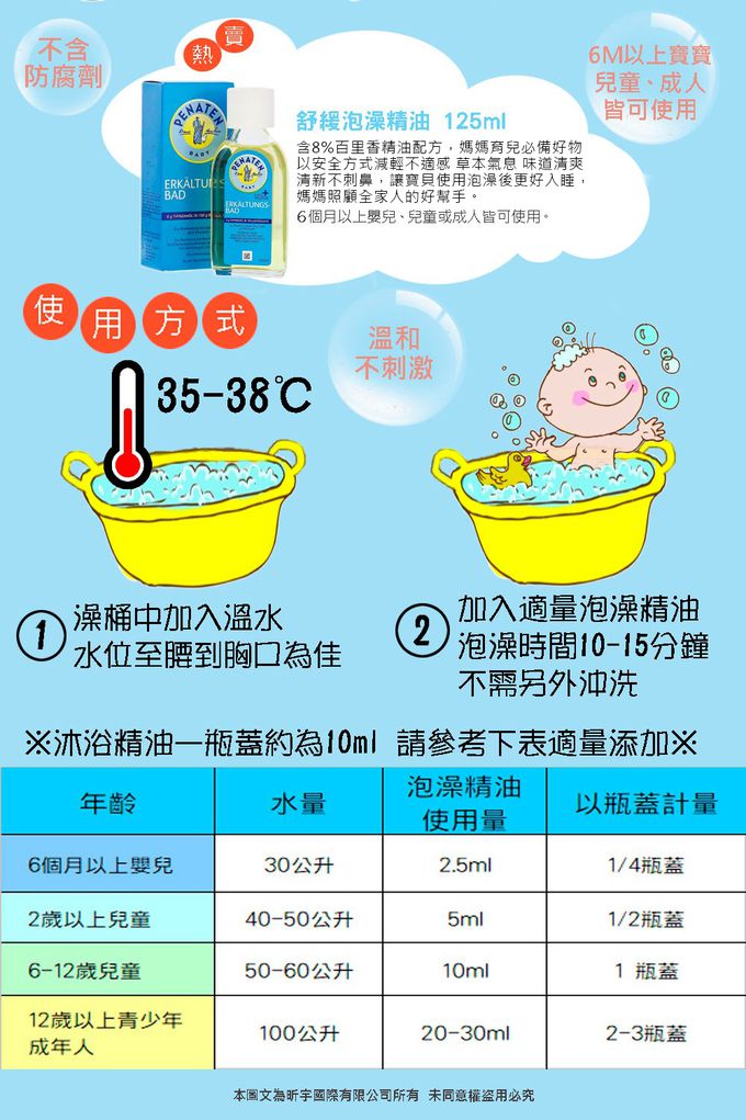 注意事項:• 6個月以下的寶寶不可使用。 • 蠶豆症者.孕婦及對百里香精油過敏者請勿使用。 • 發燒時不可使用。 • 建議泡澡溫度:35-38°C • 建議泡澡時間:10〜15分鐘左右,不可超過20分鐘。 • 建議勿同時與其它沐浴產品同時使用,以免減弱效果