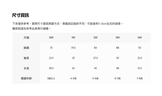1. 尺寸表單位皆為公分(cm),實際尺寸會因布料彈性、水洗、測量起訖點等因素略有誤差。2. 第一次穿之前,建議單獨手洗。3. 水溫請參照上方個別洗滌建議,以免造成移染或掉色。4. 深淺色請分開洗滌,避免造成互相移染。請使用中性洗劑。浸泡時間不宜過長。5. 衣物若含圖案、印花等設計均建議手洗;如需機洗,請務必將衣服翻面放入洗衣網、再放洗衣機,以免刮損圖樣。(若有標註不可機洗或乾洗,請勿機洗、乾洗)6. 請勿使用漂白劑、螢光增白劑及衣物柔軟劑,以免破壞布料或導致掉色。7. 洗滌後立刻晾乾,勿使用烘衣機。過分烘乾可能會破壞織物纖維、導致衣物收縮。如有熨燙需求,請低溫熨燙。8. 每件商品於拍攝時均力求忠實呈現,但因每台電腦、手機或平板等設備之螢幕亮度、解析度不同,可能會有些許色差,謝謝媽咪爸比們的體諒。9. 提醒您,七天猶豫期並非七天試用期呦!商品需保持全新、完整包裝始可申請退換貨,造成不便敬請見諒。10. 預購為海外同步代購,如遇缺貨會儘速通知、協助取消訂單/退款等事宜。