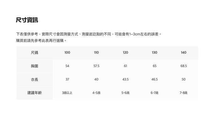 1. 尺寸表單位皆為公分(cm),實際尺寸會因布料彈性、水洗、測量起訖點等因素略有誤差。2. 第一次穿之前,建議單獨手洗。3. 水溫請參照上方個別洗滌建議,以免造成移染或掉色。4. 深淺色請分開洗滌,避免造成互相移染。請使用中性洗劑。浸泡時間不宜過長。5. 衣物若含圖案、印花等設計均建議手洗;如需機洗,請務必將衣服翻面放入洗衣網、再放洗衣機,以免刮損圖樣。(若有標註不可機洗或乾洗,請勿機洗、乾洗)6. 請勿使用漂白劑、螢光增白劑及衣物柔軟劑,以免破壞布料或導致掉色。7. 洗滌後立刻晾乾,勿使用烘衣機。過分烘乾可能會破壞織物纖維、導致衣物收縮。如有熨燙需求,請低溫熨燙。8. 每件商品於拍攝時均力求忠實呈現,但因每台電腦、手機或平板等設備之螢幕亮度、解析度不同,可能會有些許色差,謝謝媽咪爸比們的體諒。9. 提醒您,七天猶豫期並非七天試用期呦!商品需保持全新、完整包裝始可申請退換貨,造成不便敬請見諒。10. 預購為海外同步代購,如遇缺貨會儘速通知、協助取消訂單/退款等事宜。