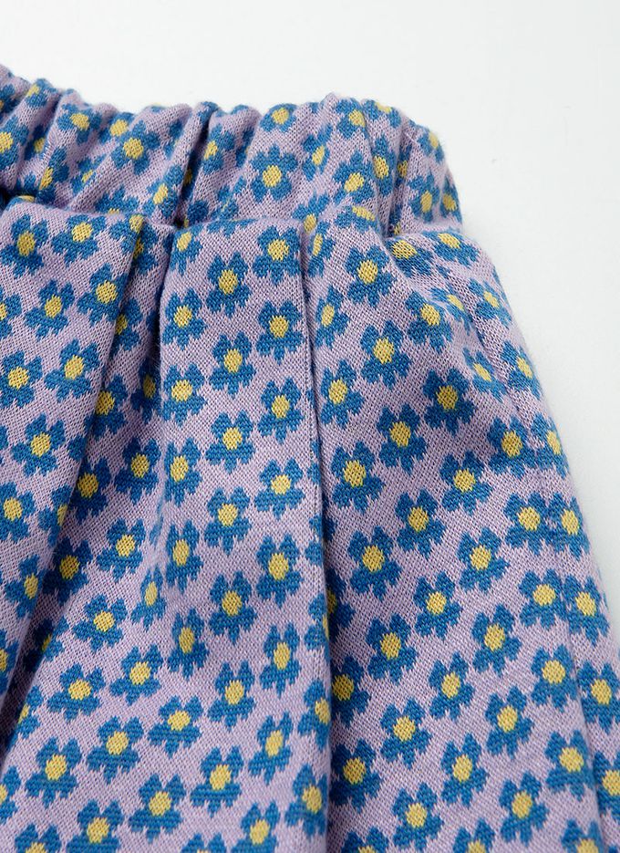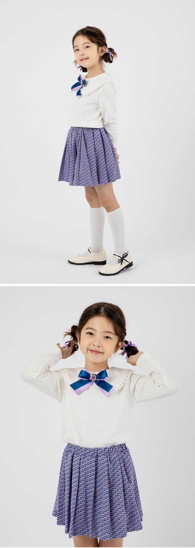 韓國 OZKIZ - 緞帶裝飾上衣花紋打褶裙套裝-白X紫