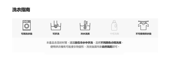 3. 水溫請參照上方個別洗滌建議,以免造成移染或掉色。
