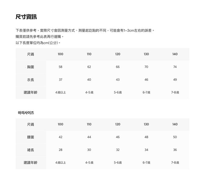 1. 尺寸表單位皆為公分(cm),實際尺寸會因布料彈性、水洗、測量起訖點等因素略有誤差。