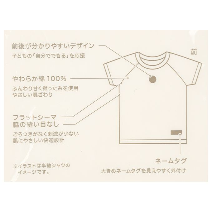 為讓幼童能獲得『自己一個人也能做到』的成就感,特意做成易分辨前後設計。(前後不同的印花,讓幼童能一眼分辨前後)
