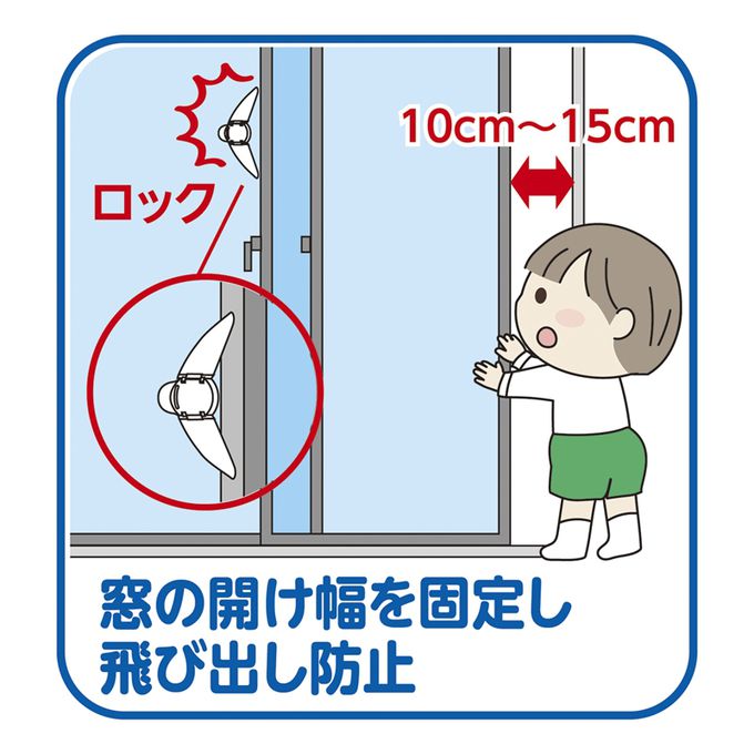 使用方式:●本產品為預防幼童發生事故或受傷,並不能取代家長的注意和關懷。●本產品並非防盜用品。【安裝方法】●請決定窗戶(靠近室內的窗框)的開啟寬度(10cm~15cm),並將其安裝在幼童無法觸及的位置。●請先徹底擦拭安裝位置的油污及污垢後再進行安裝。●請將主體解鎖(使羽片變平),並調整位置,使其對準室內側窗框的兩個開啟羽片,然後貼在外側窗框的室內玻璃面上。※請勿在凸凹不平或粗糙的表面上使用,以免影響粘附力。※安裝完成後,在接下來的24小時內請勿施以壓力,以確保粘性穩定。【無法安裝的窗戶】●外側窗框的玻璃面與室內窗框間的間隙小於10mm以下時。●磨砂玻璃、有紋路的玻璃等表面不平滑的窗戶。【使用方法】★有插圖