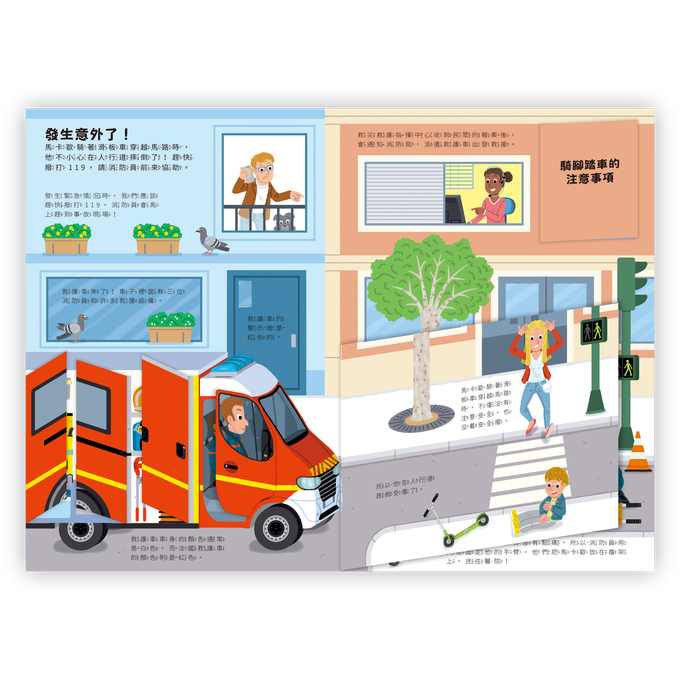 本書運用精緻的立體機關吸引讀者的注意力,像是翻開後看見救護車內部、拉動後將病患移到擔架上、為消防員戴上消防頭套、超大立體頁的救火場景等。在閱讀的過程中,動手推拉翻轉互動機關,引發學習的興趣,讓乏味的知識理論變得有趣又好玩!一邊遊玩,一邊了解消防員的工作內容,搭配栩栩如生的立體機關,觀看刺激的打火過程。